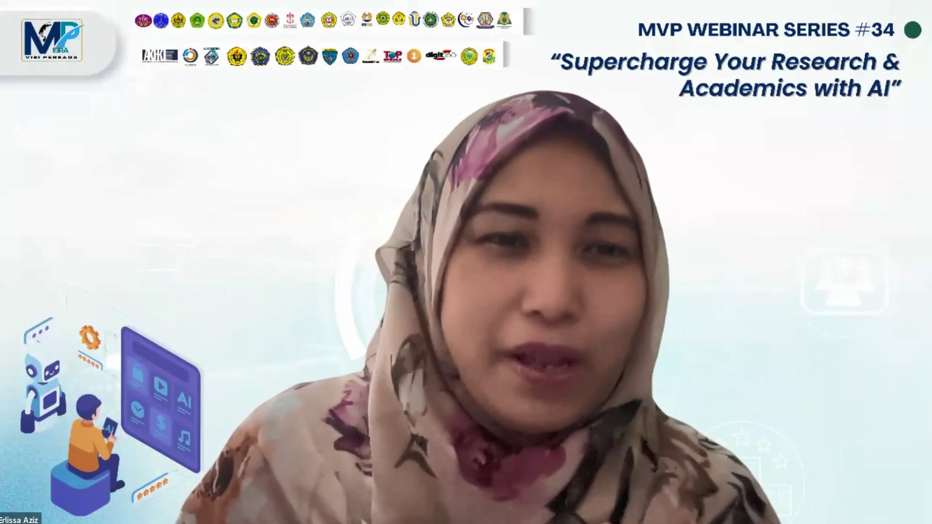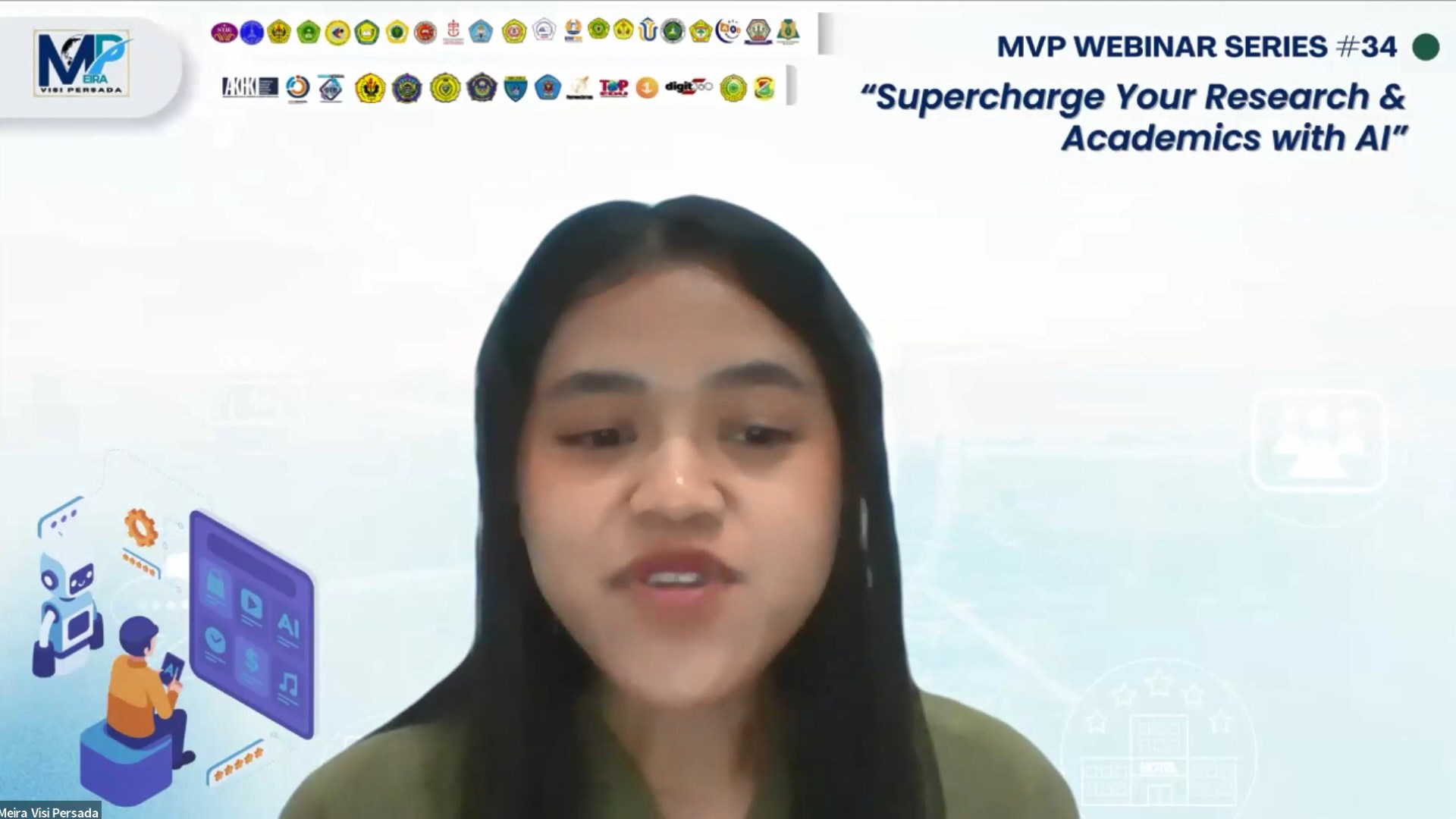 Sabtu, 13 Desember 2025 – Yayasan Meira Visi Persada kembali menunjukkan komitmennya dalam mendukung pengembangan akademik dan literasi teknologi dengan sukses menyelenggarakan Webinar Series ke-34 bertajuk “Supercharge Your Research and Academics with AI”. Kegiatan ini dilaksanakan secara daring dan diikuti oleh peserta dari berbagai kalangan akademisi, peneliti, guru, mahasiswa, serta praktisi pendidikan.